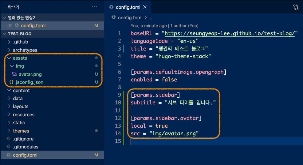 config.toml 파일에 내용을 수정, 추가하여 블로그의 형태를 만듭니다.